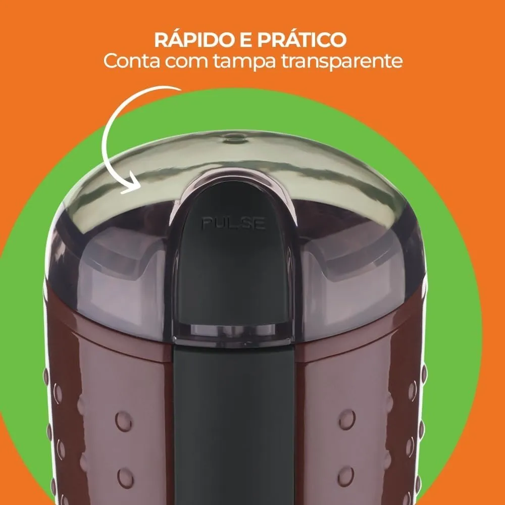 Com potência de 150W e lâmina em aço inoxidável, o moedor entrega uma moagem rápida e uniforme, capaz de processar até 45 gramas de café em poucos segundos. É ideal para preparar doses diárias de café recém-moído, garantindo aroma e sabor superiores em comparação com o café industrializado.